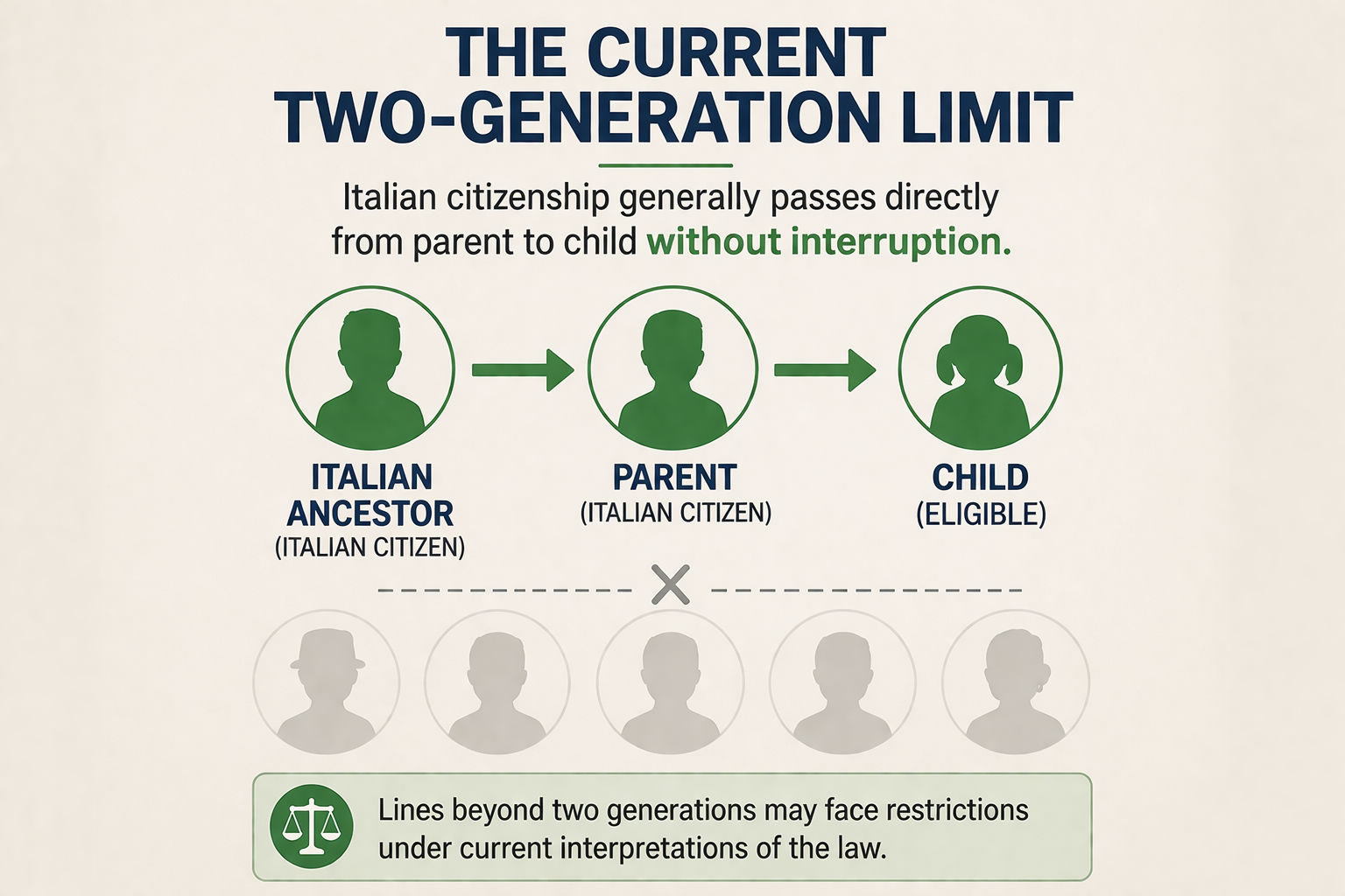 In practical terms, this means citizenship must pass directly from parent to child without interruption. In many cases where the Italian ancestor is a grandparent or great-grandparent, the pathway may now be more complicated or restricted.